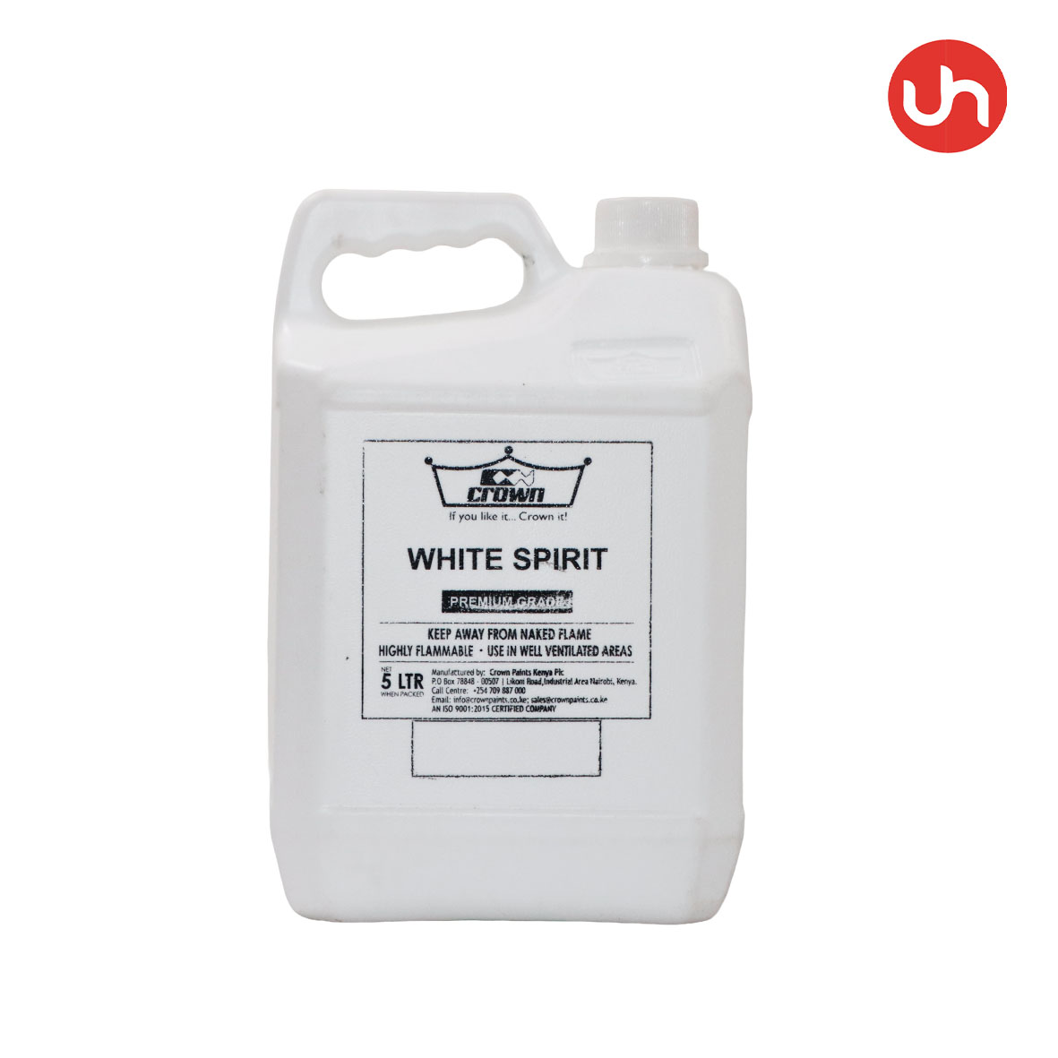 Crown White Spirit is supplied as a clear, fast-evaporating liquid, available in 1L, 5L, and 20L containers, suitable for a variety of painting and cleaning tasks.